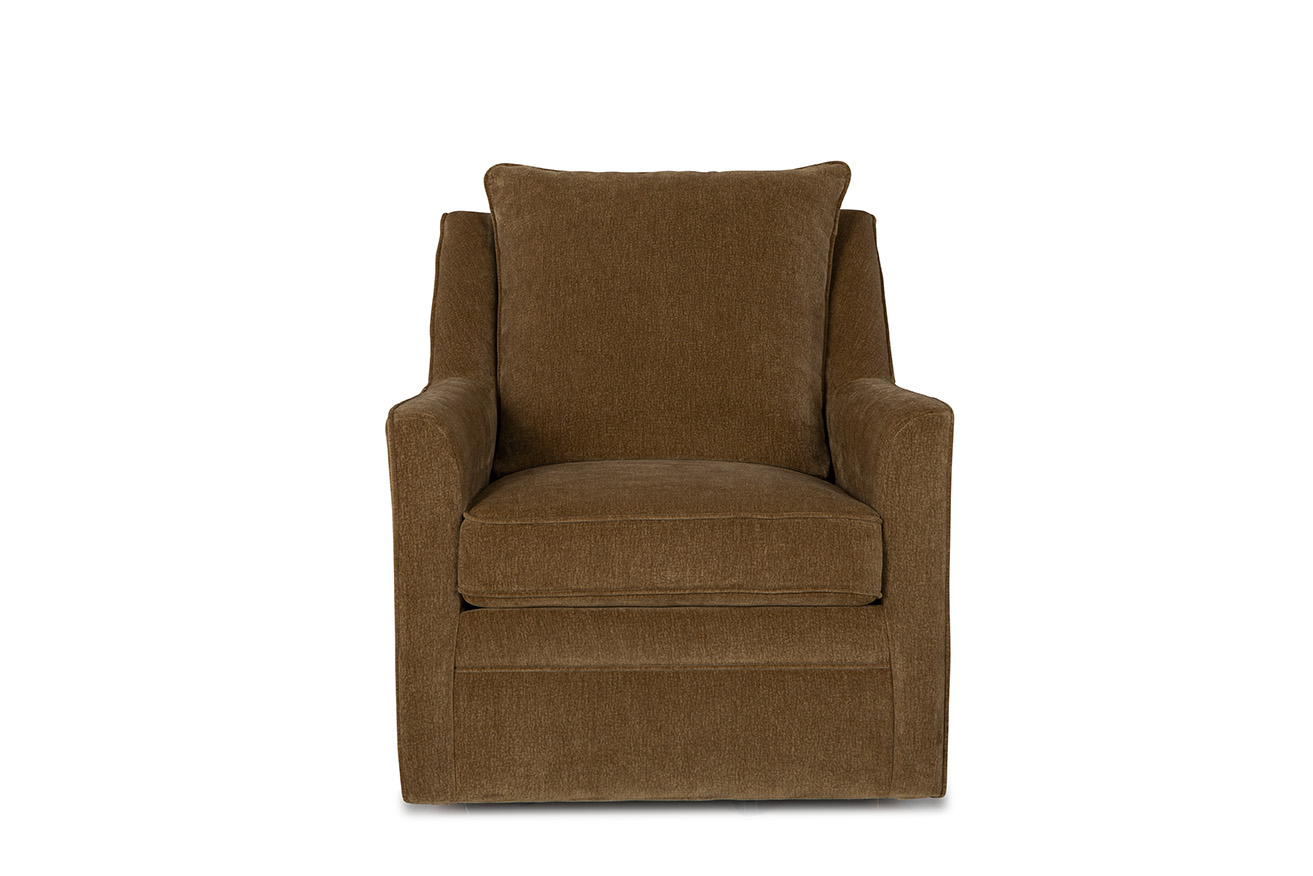 Introducing the Aubrey Swivel Chair, where elegance meets comfort in a seamless blend of chic design and soothing functionality. Enjoy a 360-degree swivel action for effortless movement, while its clean-lined simplicity adds a touch of modern sophistication to any space. The smooth sheltered arms with piped seams offer both style and support, complemented by a sleek yet soft pillow back for added comfort. With reversible seat and back cushions, this chair offers versatility and longevity. The Aubrey is custom built in your choice of over 700 fabric options. Make a statement with the Aubrey Swivel Chair.