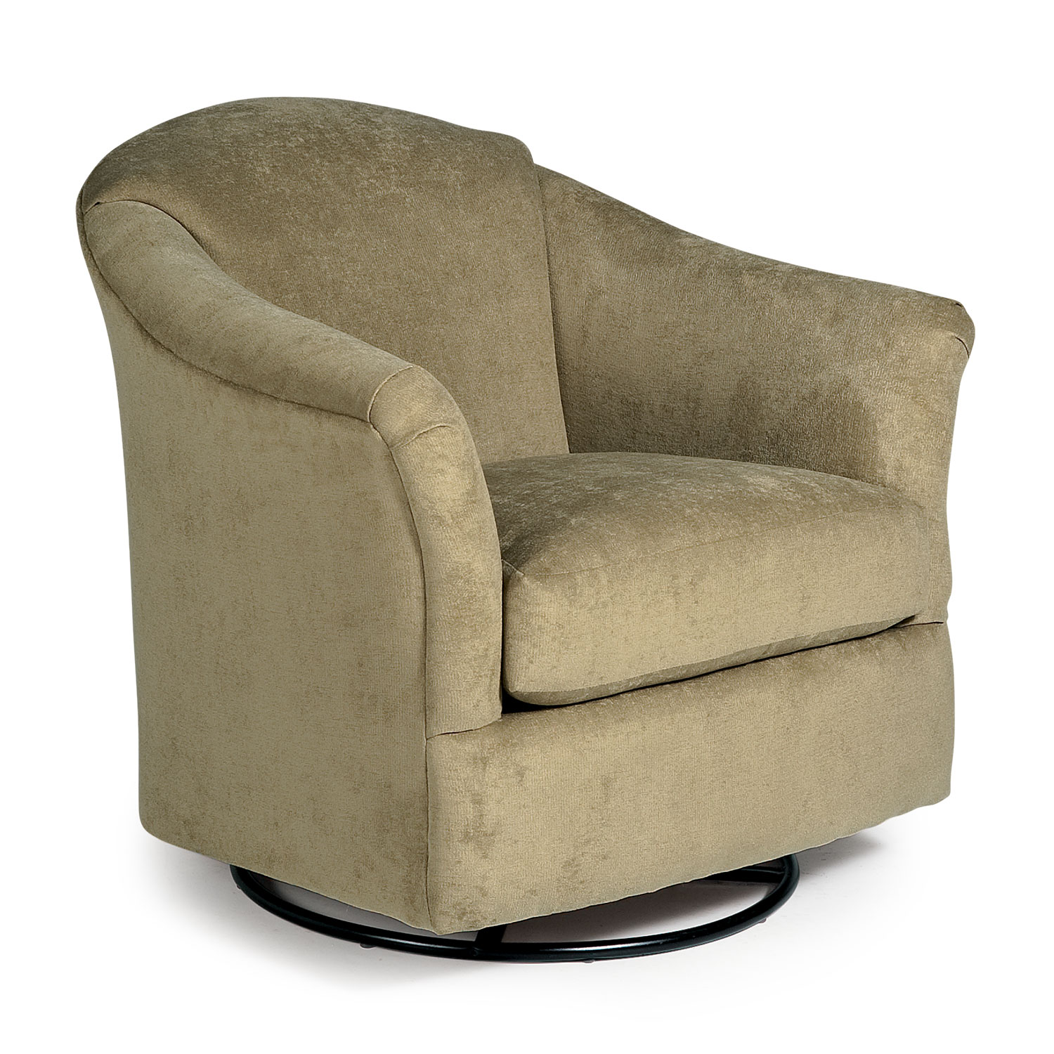 Effortlessly glide in this contemporary barrel chair. Available as a swivel chair or swivel glider, this unit has a reversible seat cushion and a slightly rounded arm with a smooth, pulled over back. The back is also slightly taller than most barrel chairs.