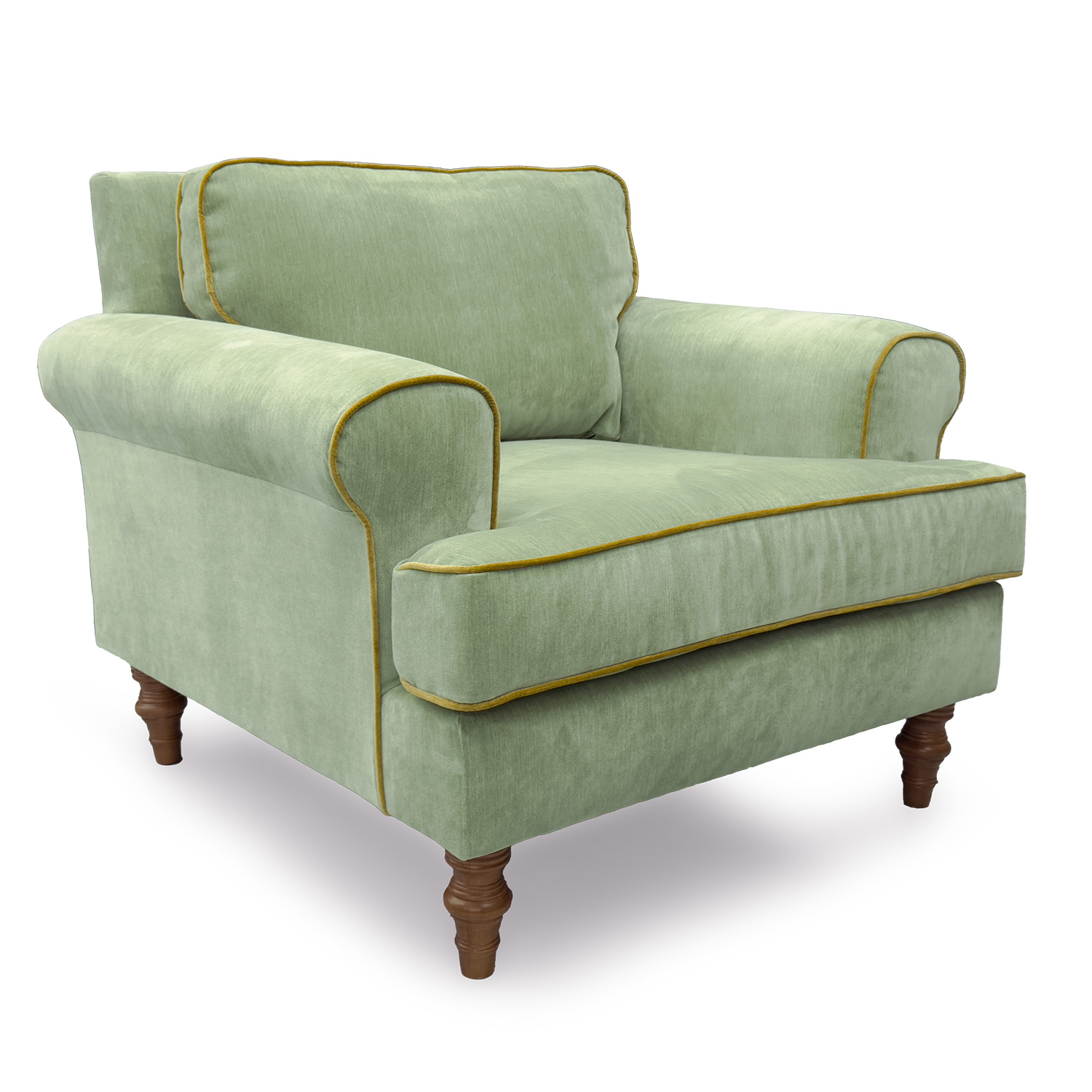 This is everyday comfort that still feels thoughtfully styled. A refined contrast cording traces each edge, highlighting the craftsmanship and lending a crisp, tailored definition that frames the chair's graceful proportions. The turned wood legs give the Faulkner Chair its signature silhouette, a subtle nod to time-worn Southern antiques and heirloom pieces that have a story.