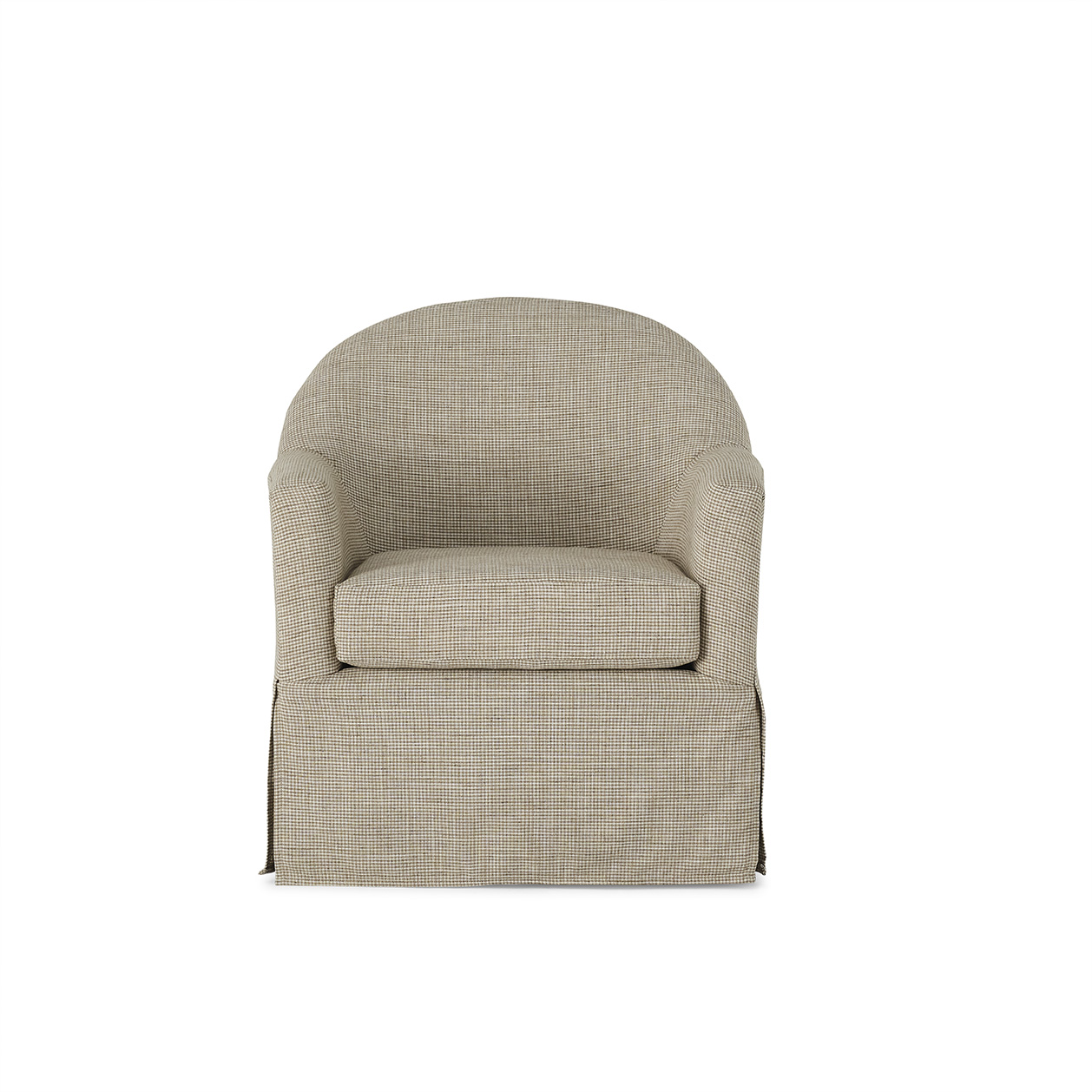 The Meg Swivel Chair brings graceful motion and classic styling together in one beautifully tailored seat. With a contoured barrel back that flows into softly rolled arms, Meg feels both sculptural and inviting—made even more charming by its tall front deck and slipcover-inspired skirt.